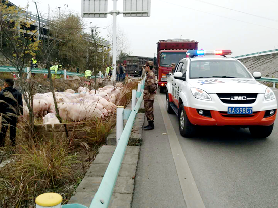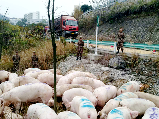 此次车祸是一辆装有几十头活猪的大货车发生了侧翻,所有的猪全部都跑了出来,场面非常混乱,局面非常难以控制。我们民兵应急分队的队员到达后,协助高速交警和路政迅速将分散乱跑的猪群集中起来。