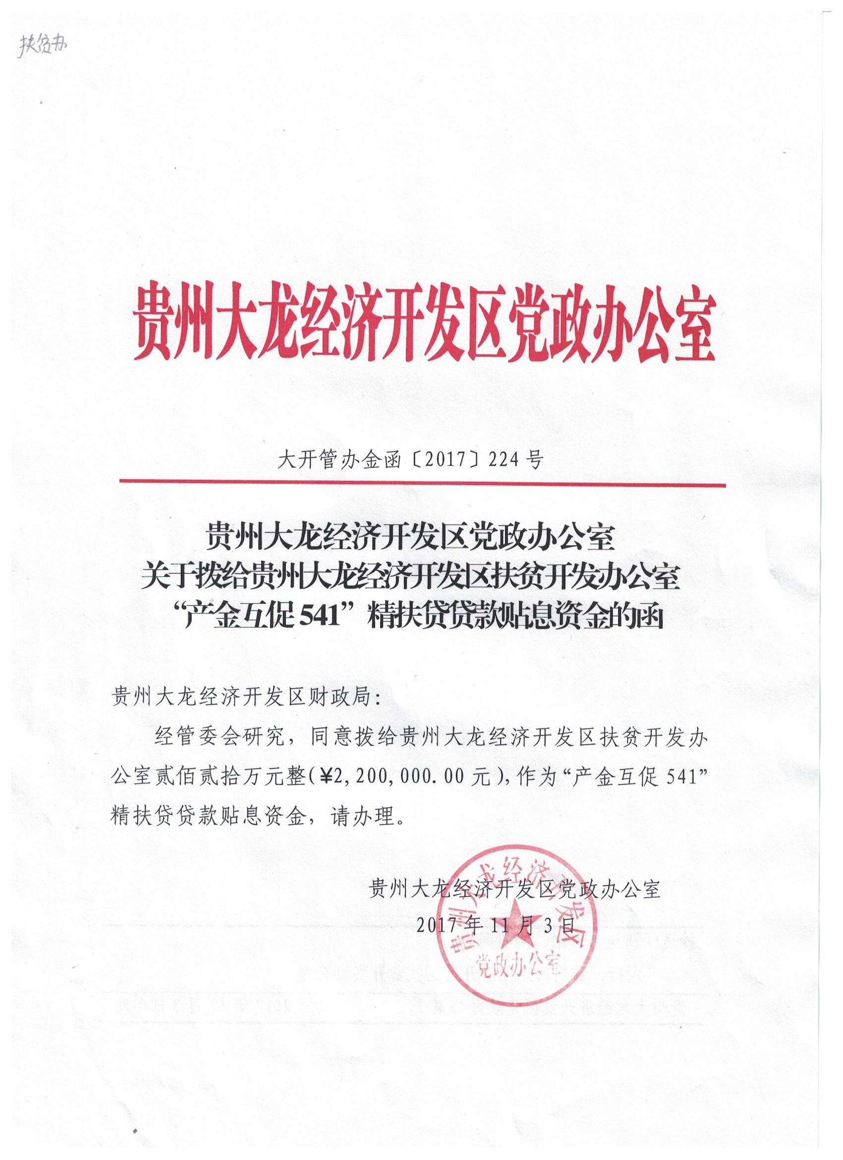 关于拨给贵州365bet体育备用网址器扶贫开发办公室“产金互促541”精扶贷贷款贴息资金的涵